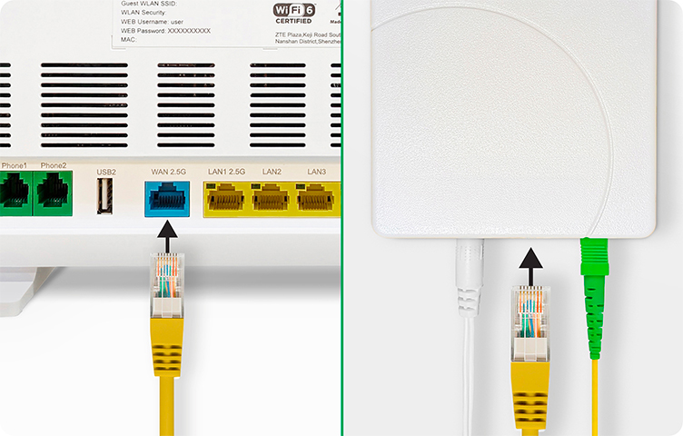 Assicurati che il cavo Ethernet sia correttamente inserito sia nella porta WAN sul pannello posteriore del modem, sia nella porta corrispondente dell’ONT.