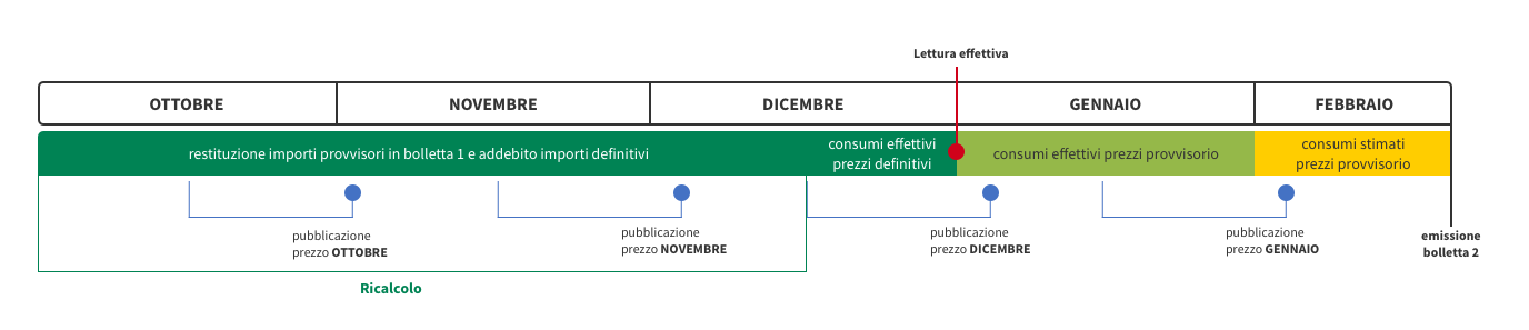- periodo 01/10 – 30/11: restituzione degli importi relativi ai consumi stimati fatturati in bolletta 1 e conseguente addebito dei consumi effettivi.