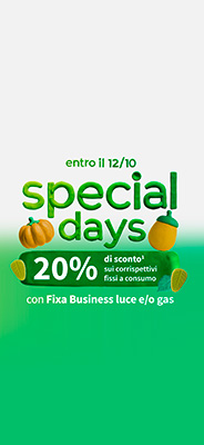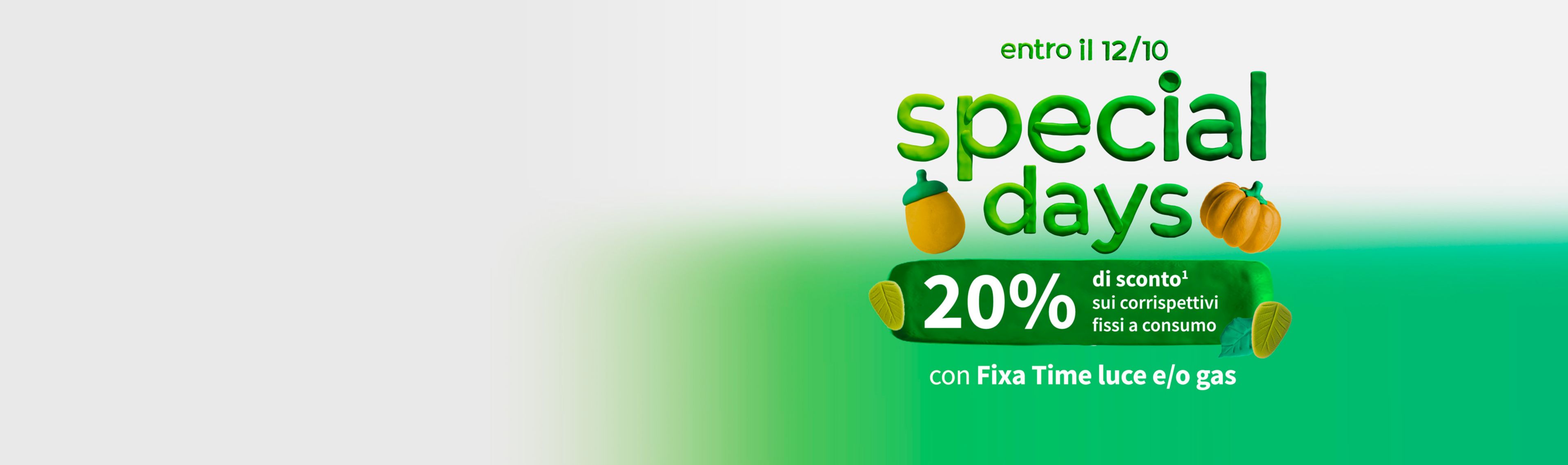 1Fino al 12/10 con Fixa Time luce e gas hai uno sconto del 20% valido per 12 mesi sui corrispettivi luce e gas che costituiscono rispettivamente, al netto delle imposte, il 42% circa e il 45% circa della spesa annuale per un cliente tipo. Lo sconto è pari all’8% circa per la luce e al 9% circa per il gas della spesa annuale del cliente tipo ante imposte. Le voci di Commercializzazione e Vendita pesano rispettivamente il 20% per la luce – considerando anche la componente di dispacciamento di 1,2311€/anno – e il 15% per il gas della spesa annua ante imposte di un cliente tipo. Promozione valida dal 28/09/2025 al 12/10/2025 solo per solo per chi passa a Plenitude da nuovo fornitore formulando una proposta di contratto dell’offerta Fixa Time per la fornitura di luce e gas sul sito internet www.eniplenitude.com, al telefono dopo aver compilato online la richiesta di ricontatto, oppure presso i Flagship store Eni Plenitude aderenti all’iniziativa o tramite comparatori abilitati o tramite il nostro servizio clienti chiamando il numero verde 800900700 o chattando con i nostri operatori. Sono escluse dalla promozione le seguenti modalità operative: nuove attivazioni luce, nuove attivazioni gas, cambio prodotto luce e gas e voltura.